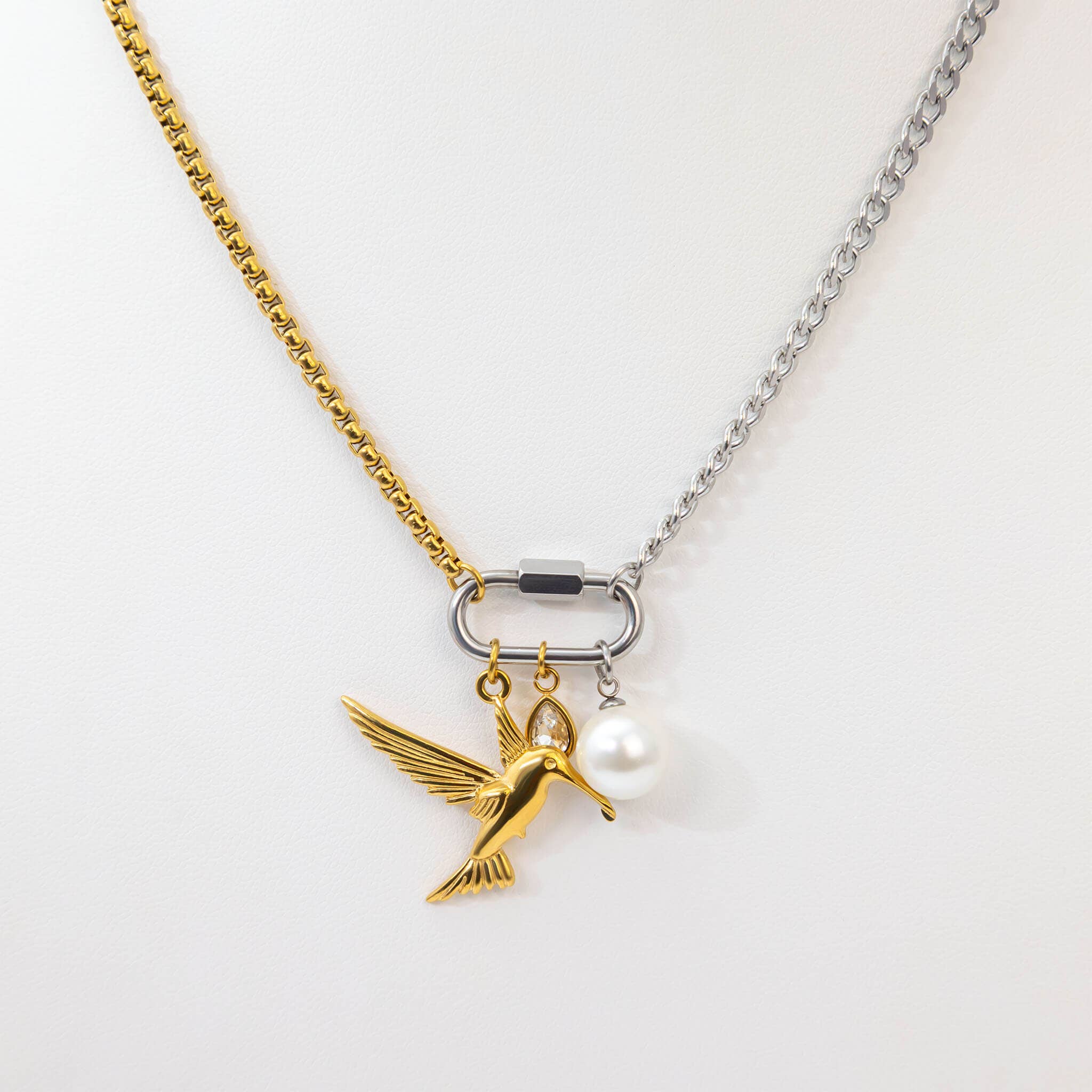Edgy meets refined in a mixed‑metal double‑chain design that pairs warm gold and cool silver for clean contrast and depth. A modern carabiner clasp anchors the look as a sleek focal point while providing a secure, easy on‑off closure. Crafted in premium, hypoallergenic stainless steel with a tarnish‑resistant finish for lasting shine and comfortable daily wear, the adjustable length lets you style it close like a choker or longer for layered looks from desk to dinner.
