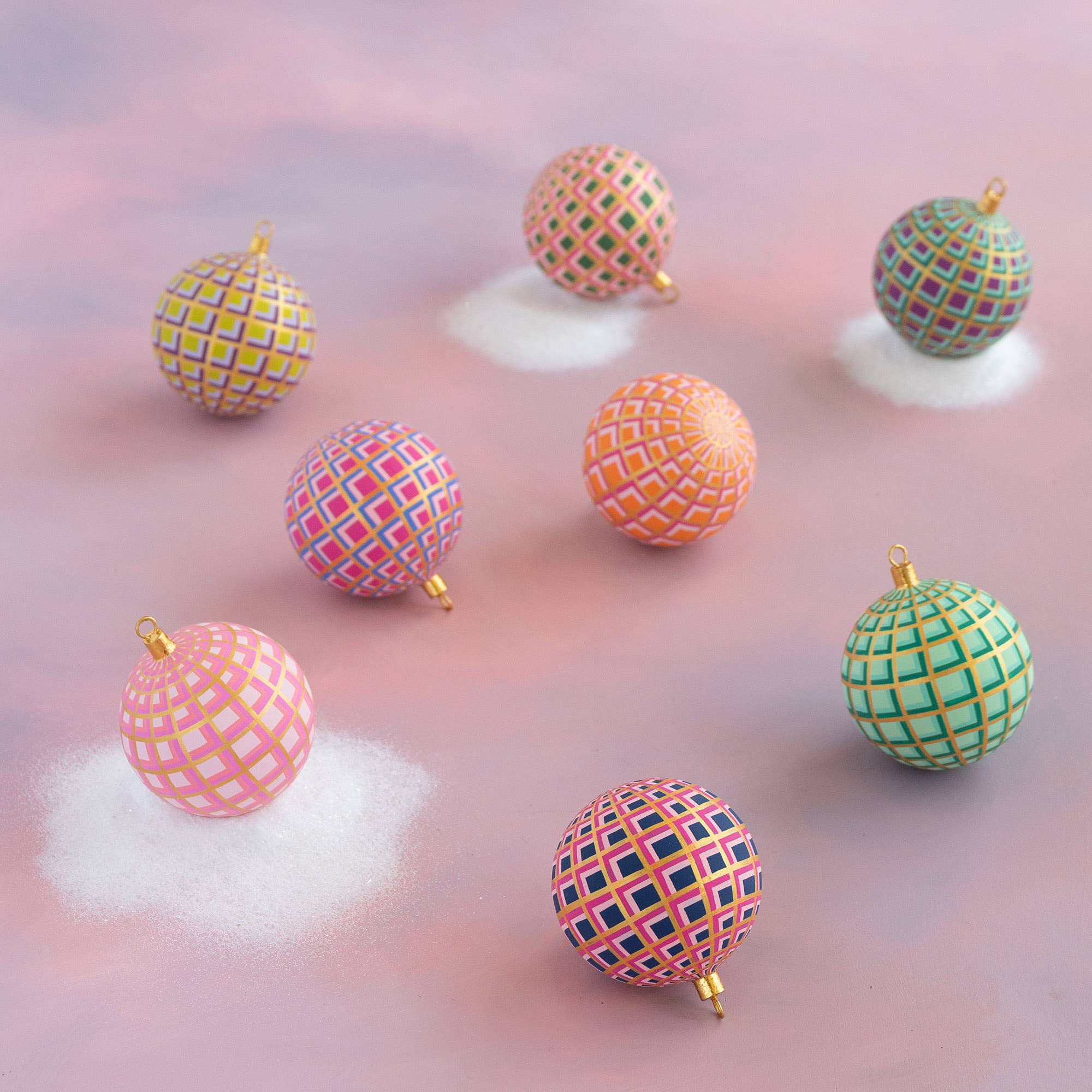 Welcome to Glitterville! Our Art Deco Plaid Ball Ornaments are a delightful addition to your holiday decor. Handcrafted with attention to detail, these paper mache ornaments infuse your holiday with sparkle and joy. Each 4-inch ornament, available in 8 assorted designs, brings a touch of enchantment to your home. Remember, at Glitterville, every day is a holiday!