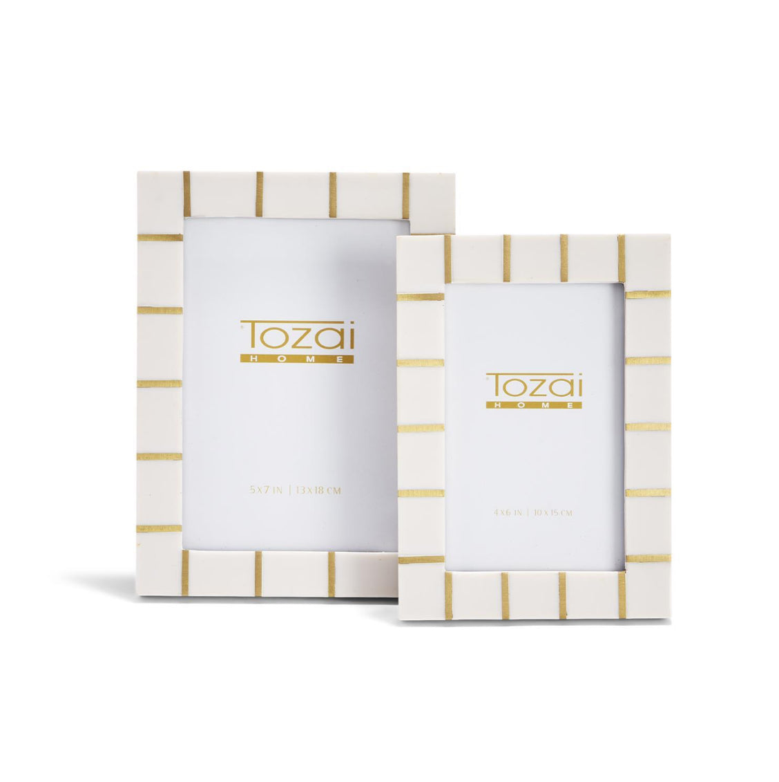 This timeless frame will hold your favorite memories in style forever. Crafted in resin with gold metal finishes this is a beautiful frame that can fit into almost any environment.