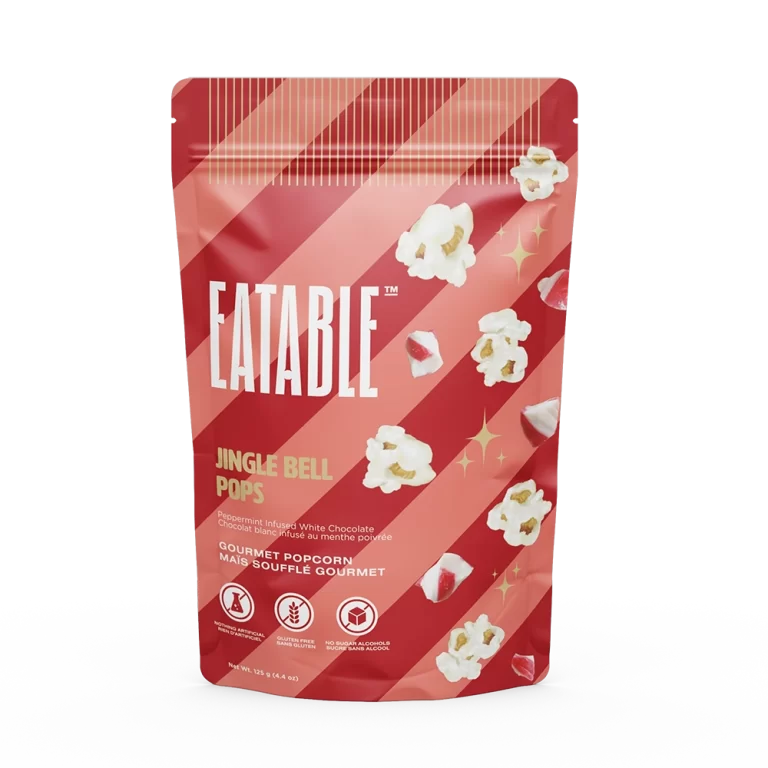 Festive. Fresh. Sweet. 🔔🍿 EATABLE’s original bestselling holiday flavour release! Belgian white chocolate-covered kettle corn sprinkled with candy cane and peppermint-infused sugar crystals that literally POP in your mouth. A decadent treat for carefree mornings, and gatherings around the brunch table with your loved ones during the festive season. 125g