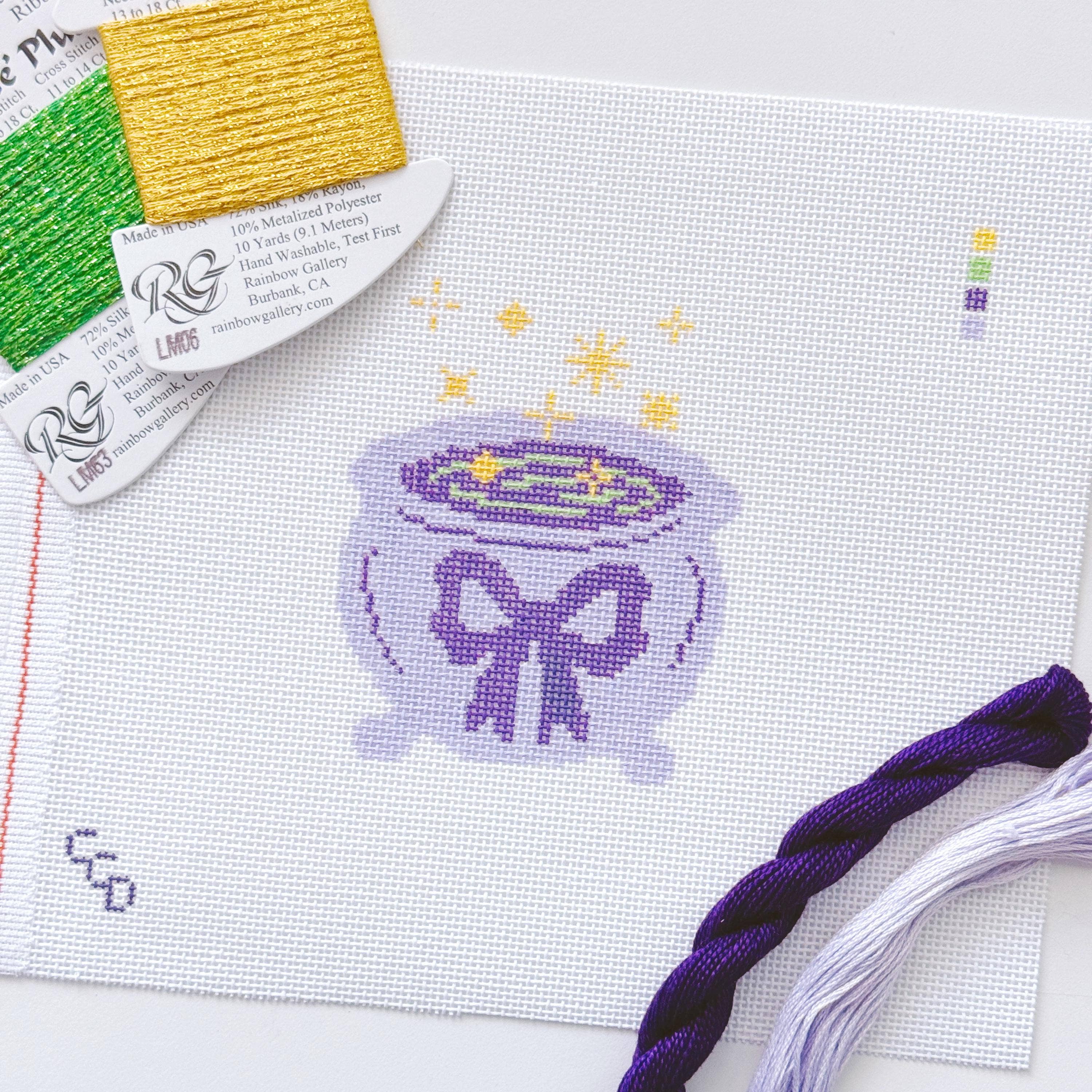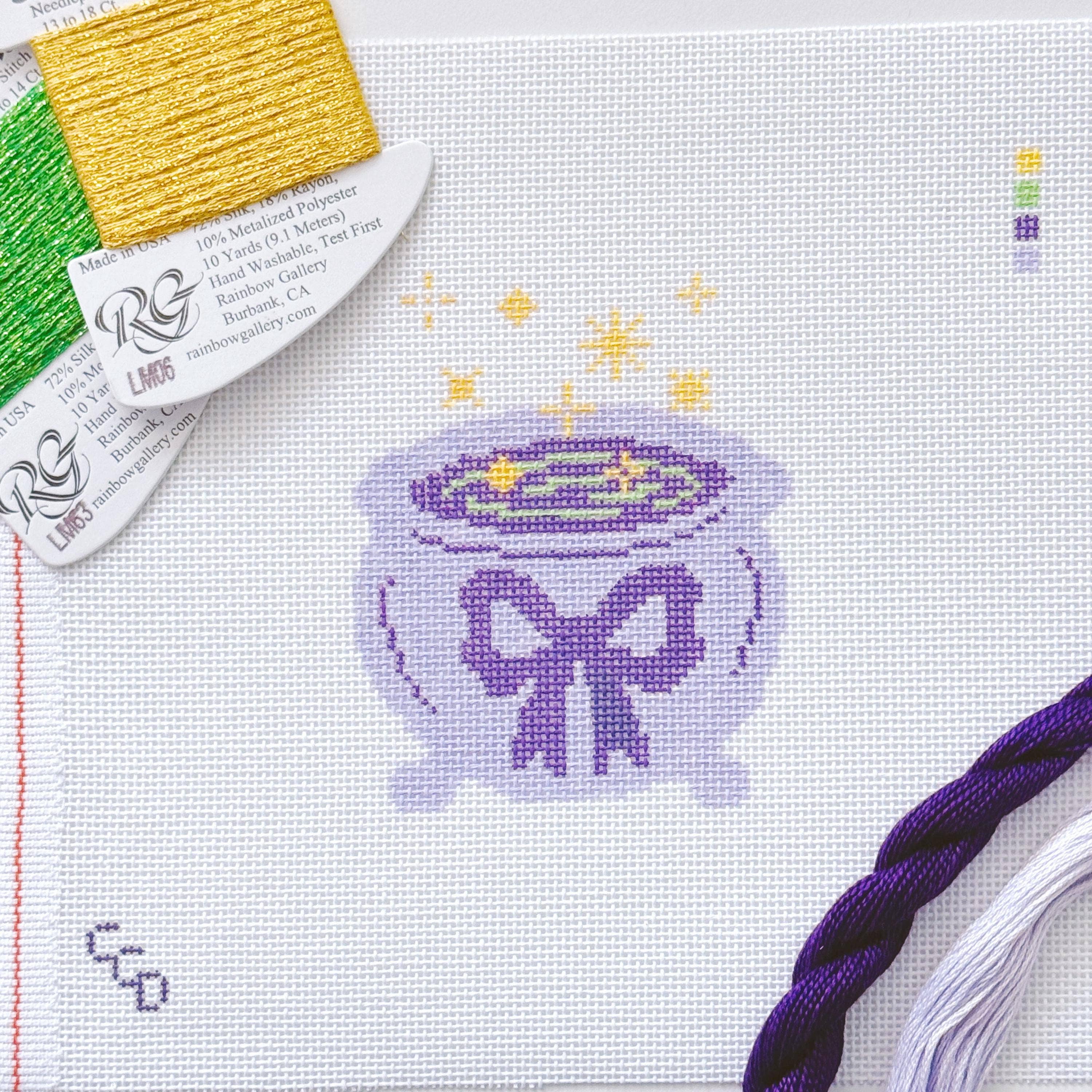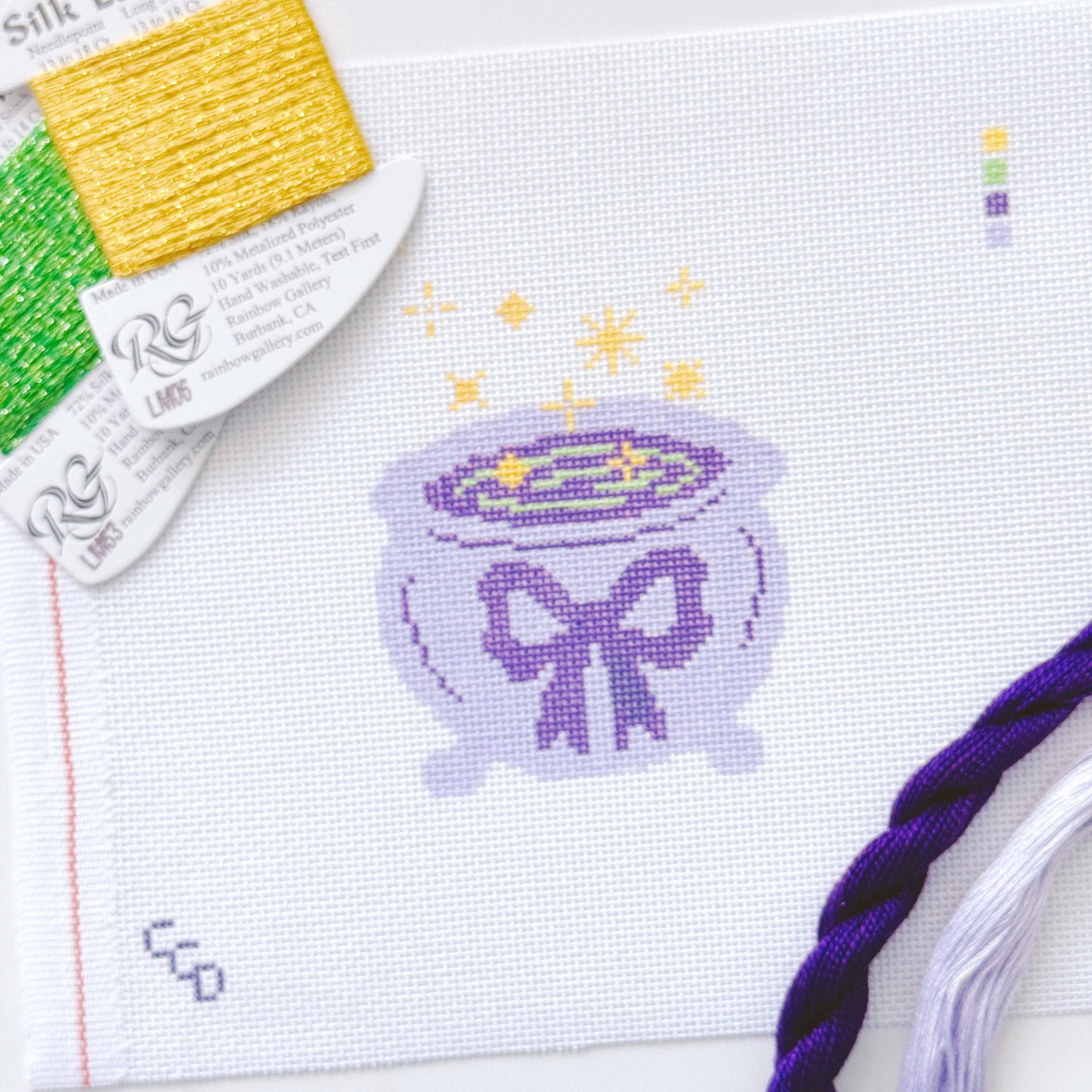 Stitch something spooky and chic with our Magic Cauldron Halloween Needlepoint Canvas. This modern and trendy design features a charming black cauldron topped with a whimsical bow, perfect for adding a playful touch to your fall stitching projects.
