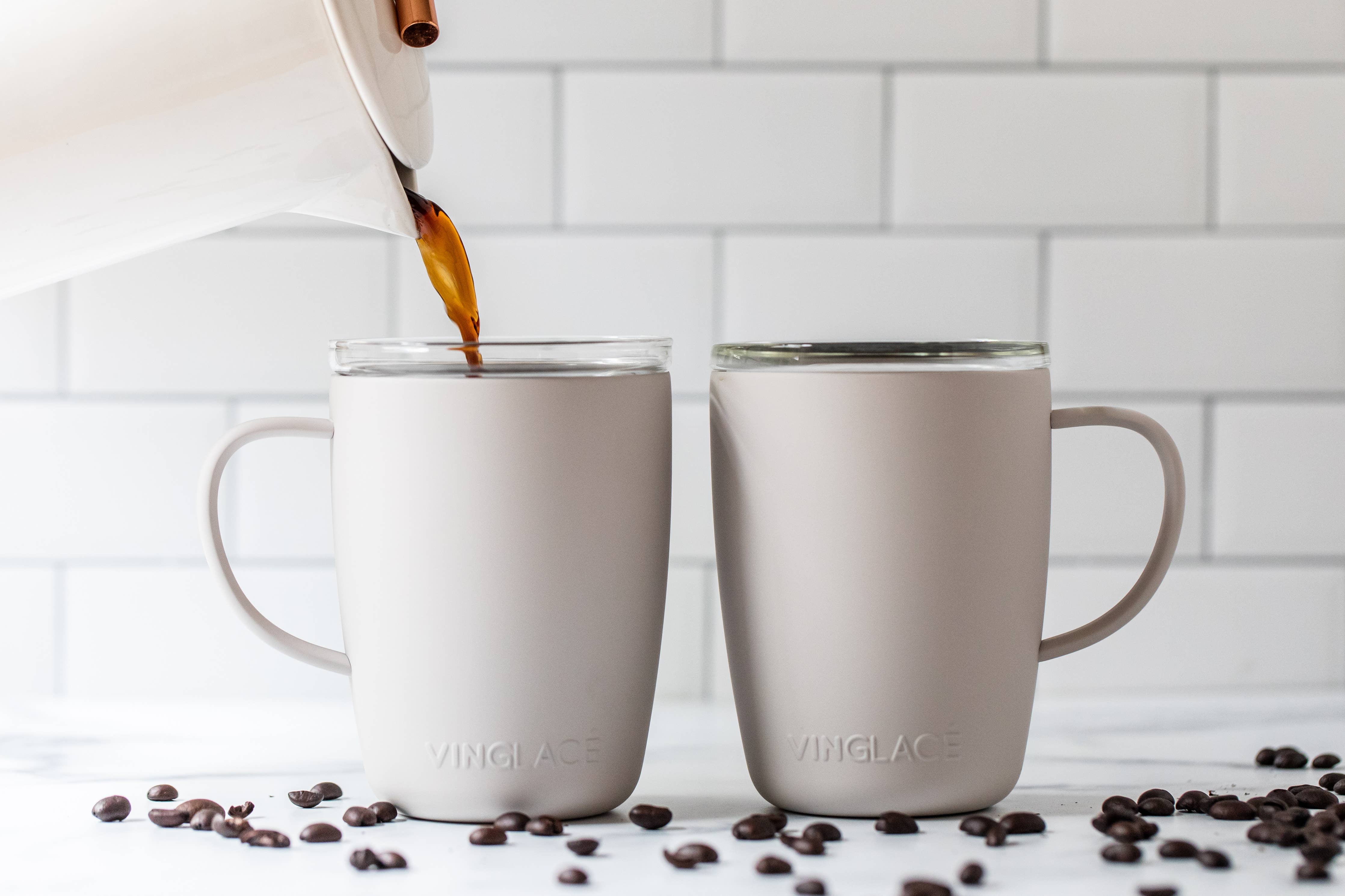 Elevate your mornings with our Coffee Cup in powder coated White. Keep 12 oz. of coffee piping hot while you start your day in style. Our coffee cups have a removable, dishwasher safe, glass insert. Say goodbye to that metallic taste and coffee stains. Comes with a slide close lid.